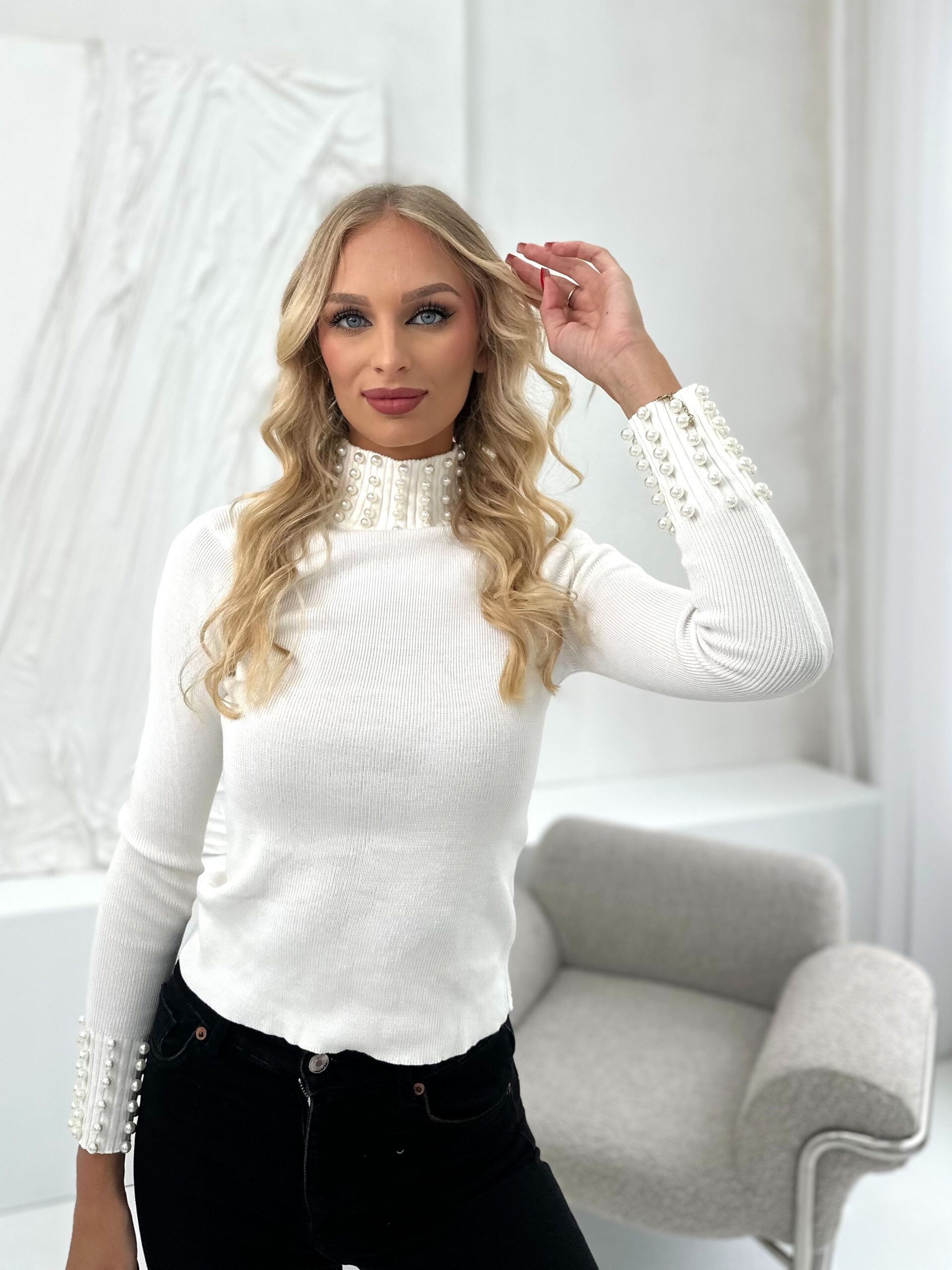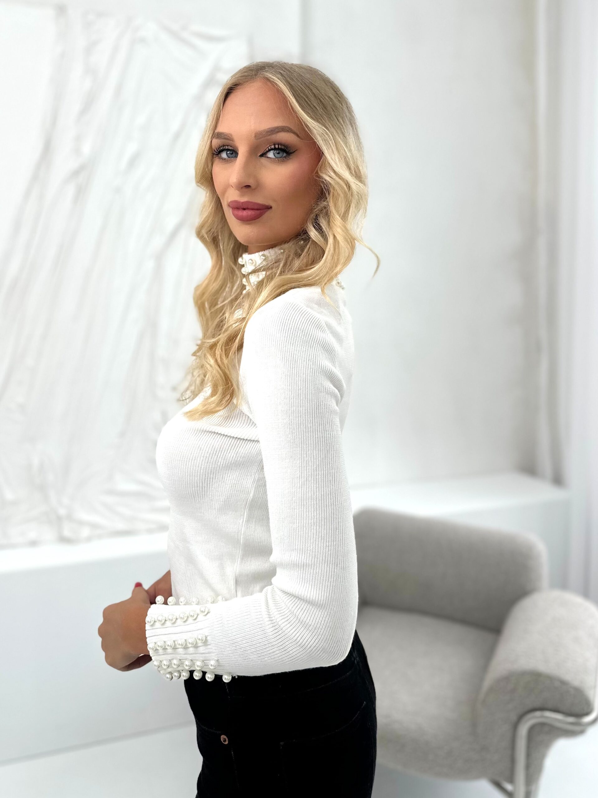 Bluzka z Półgolfem Gładka Z Perłami Bona Biała