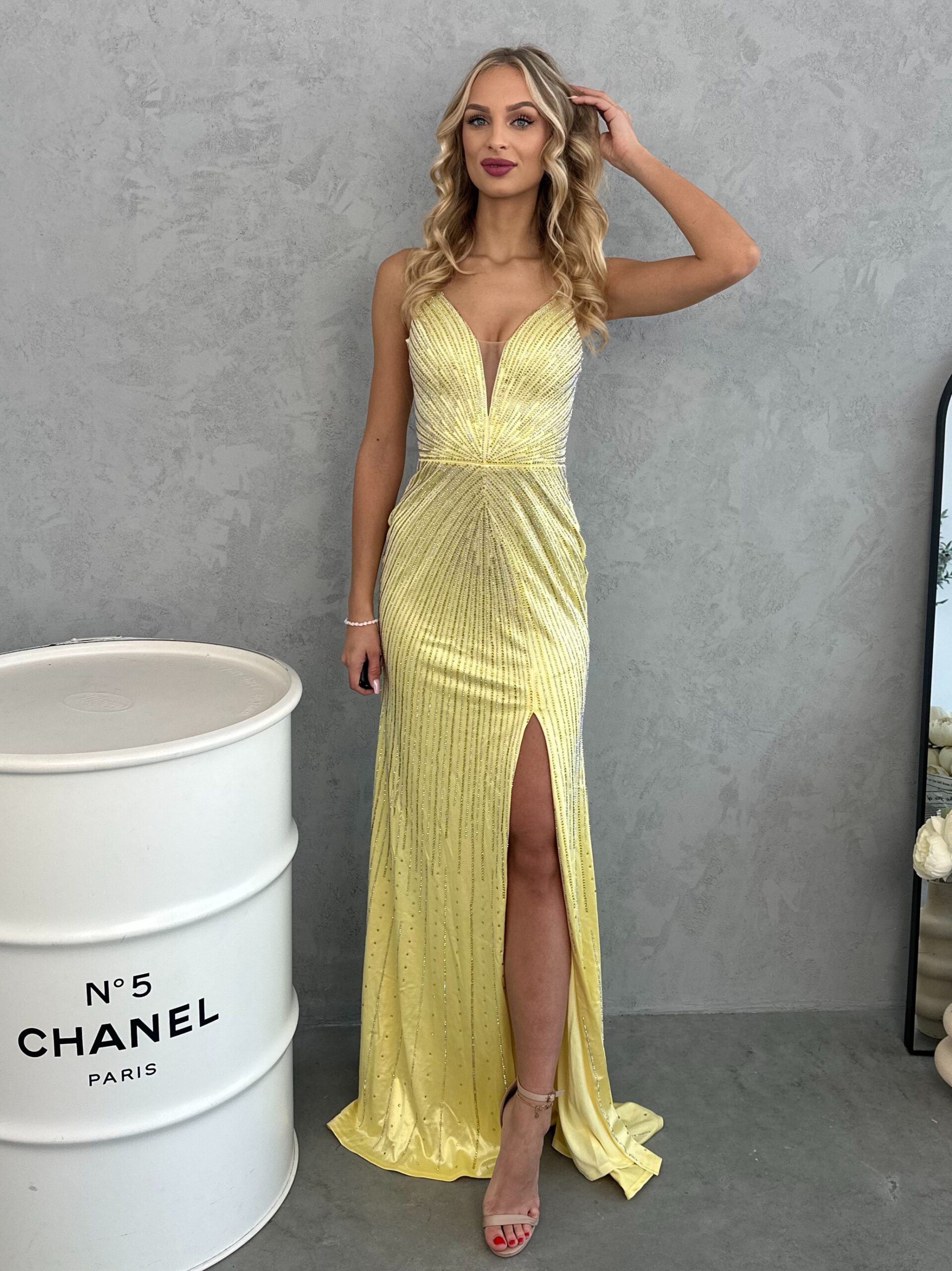 Dreamlike dress fitted with crystals and a V-neck. It looks very sensual and original. The sequin appliqués on the front of the dress create a unique texture, giving the whole piece a one-of-a-kind look. The strapless dress sensually reveals the back. Carefully placed sequin appliqués create a one-of-a-kind effect. Additionally, feathers sewn from the waistline give the dress a unique character. This unique touch makes the dress incredibly feminine. The leg slit will highlight your shapely legs. shoulder straps They subtly accentuate the shoulders and neckline, while the fitted cut elongates the silhouette and adds grace. Rich embellishments add a luxurious touch to the outfit, so you don't need many accessories – this dress speaks for itself. Nova dress This is a choice for those who want to express their uniqueness at special events. This is a creation for true women who want to shine, exuding inimitable charm. The dress has a slightly flared hem. V-shaped neckline. Tapered at the waist, it beautifully accentuates the waist, hips, and bust.