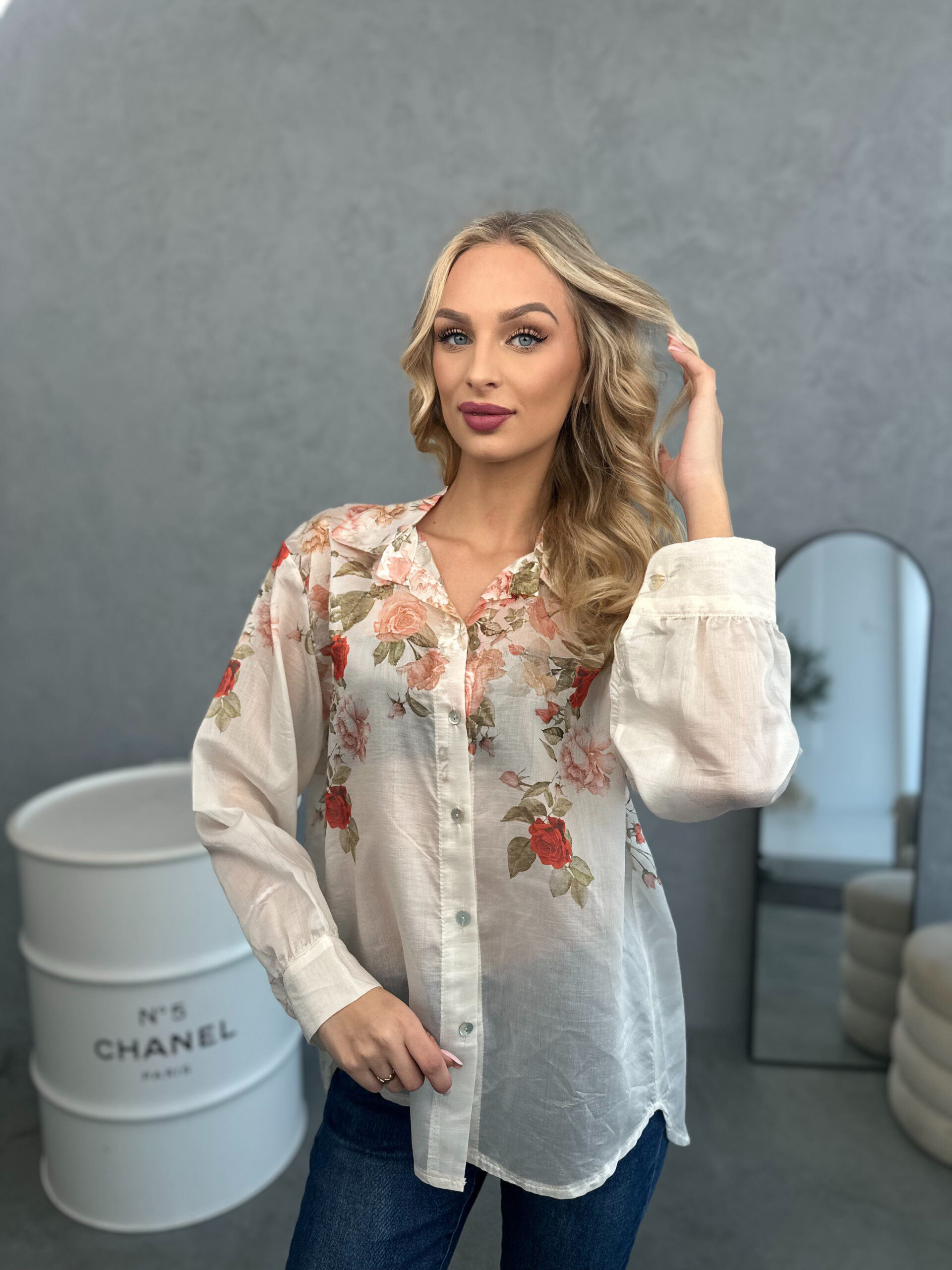 Táto štýlová biela kvetovaná košeľa má voľnejší, oversized strih, ktorý sa perfektne hodí k rôznym outfitom. Vďaka všestrannému strihu je perfektným základom pre elegantné aj nadčasové outfity.