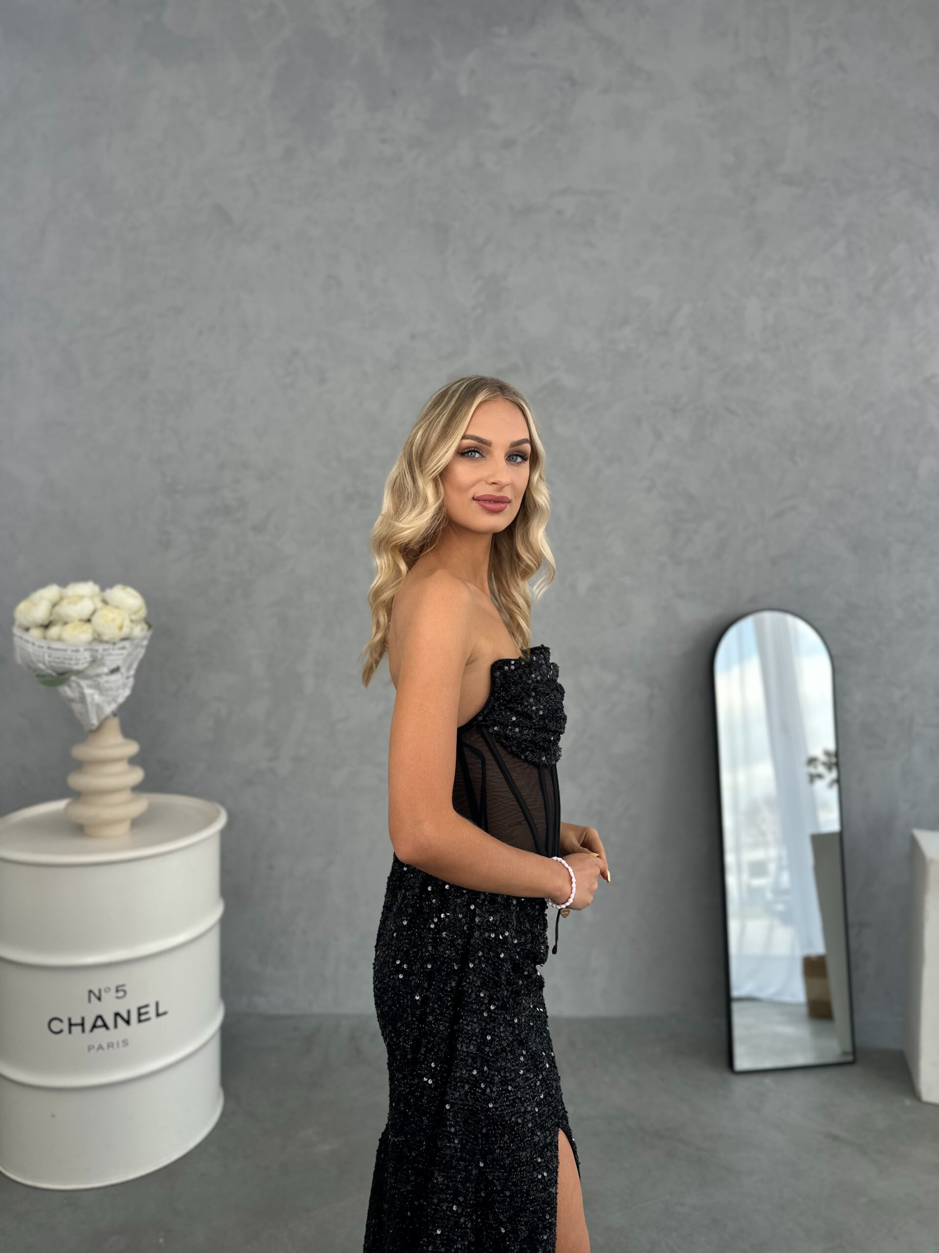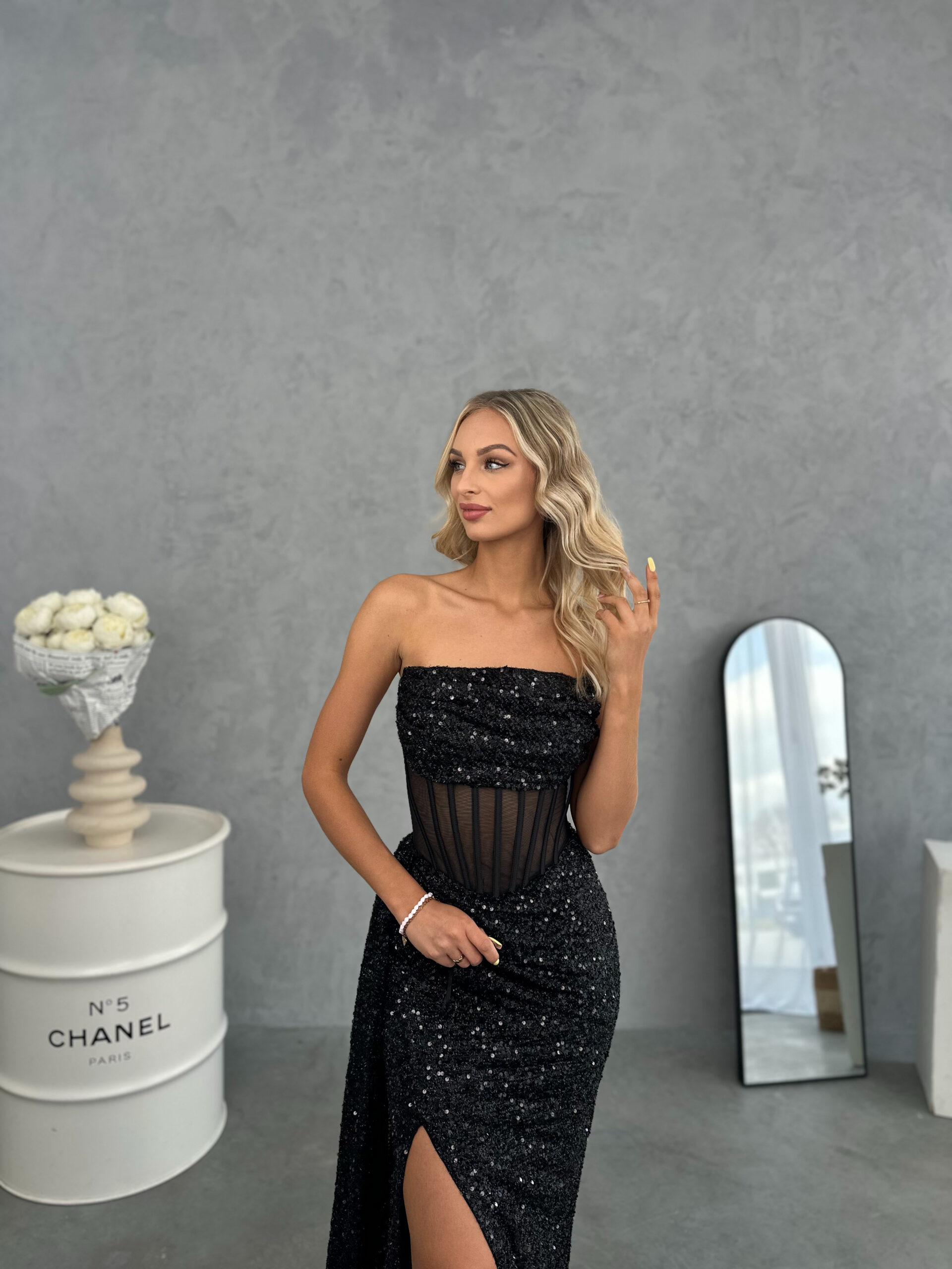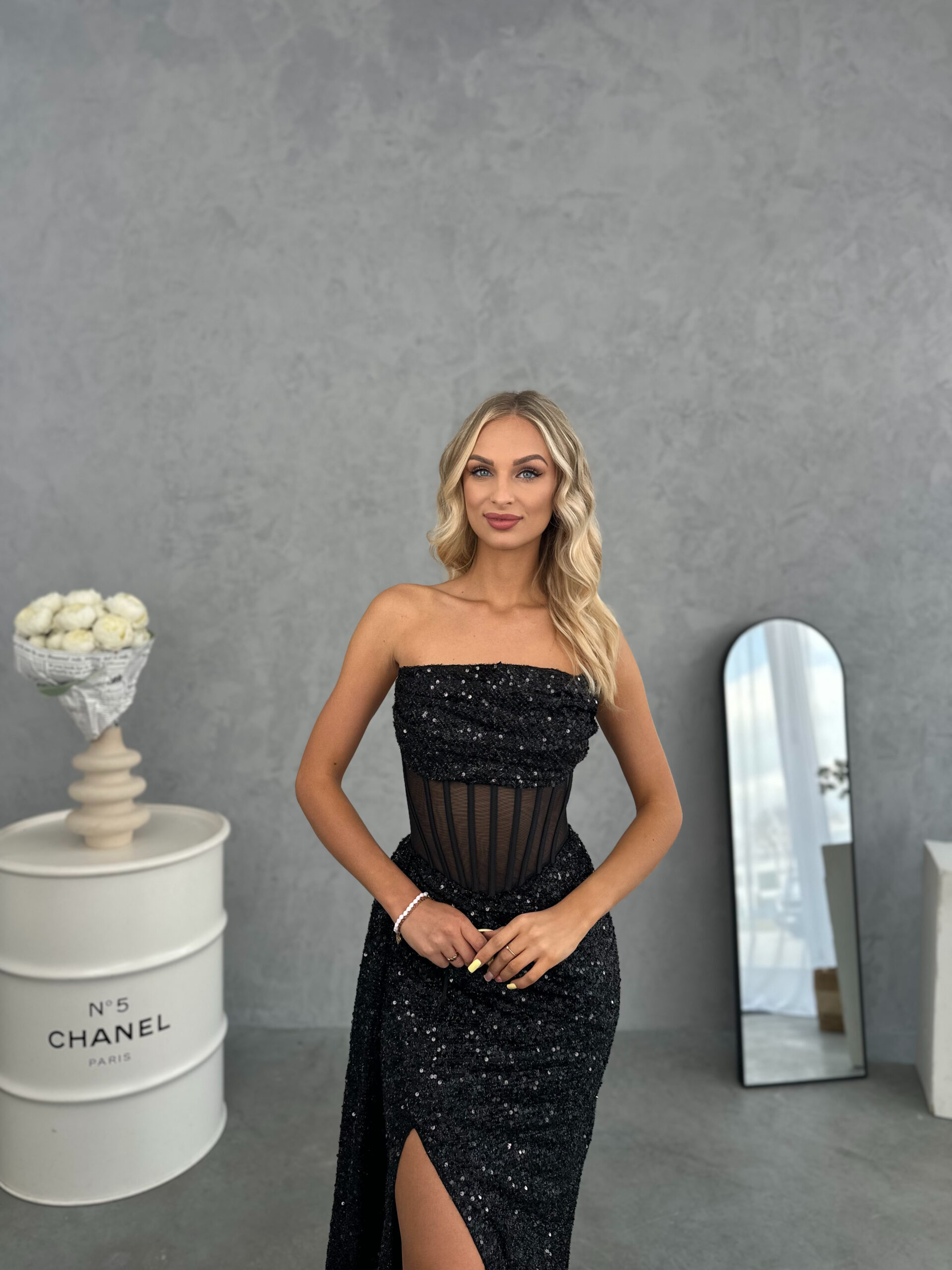 Čierne korzetové šaty s flitrami a rozparkom Calista