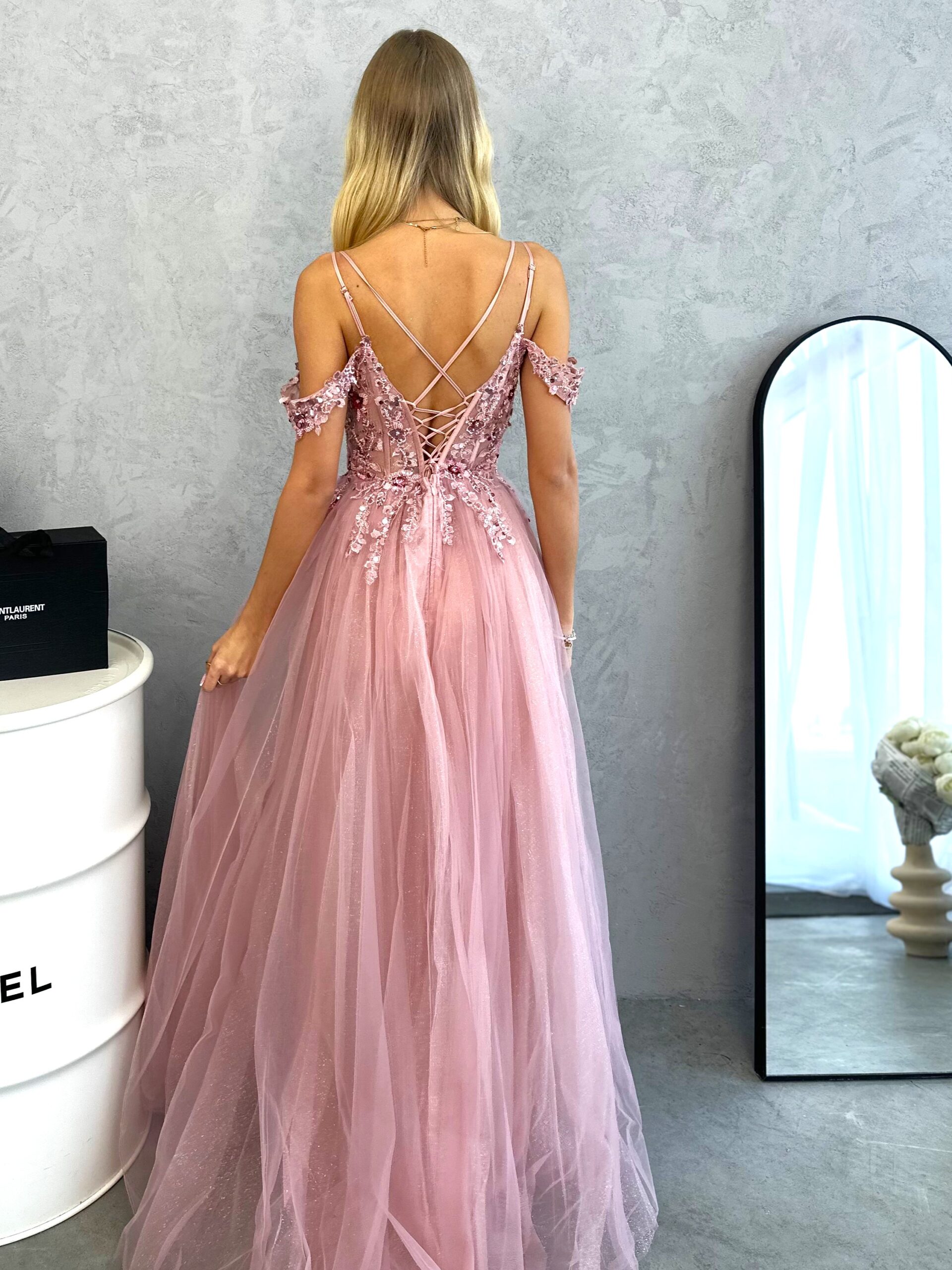 Model Maxi šaty Inez s tylovým korzetom