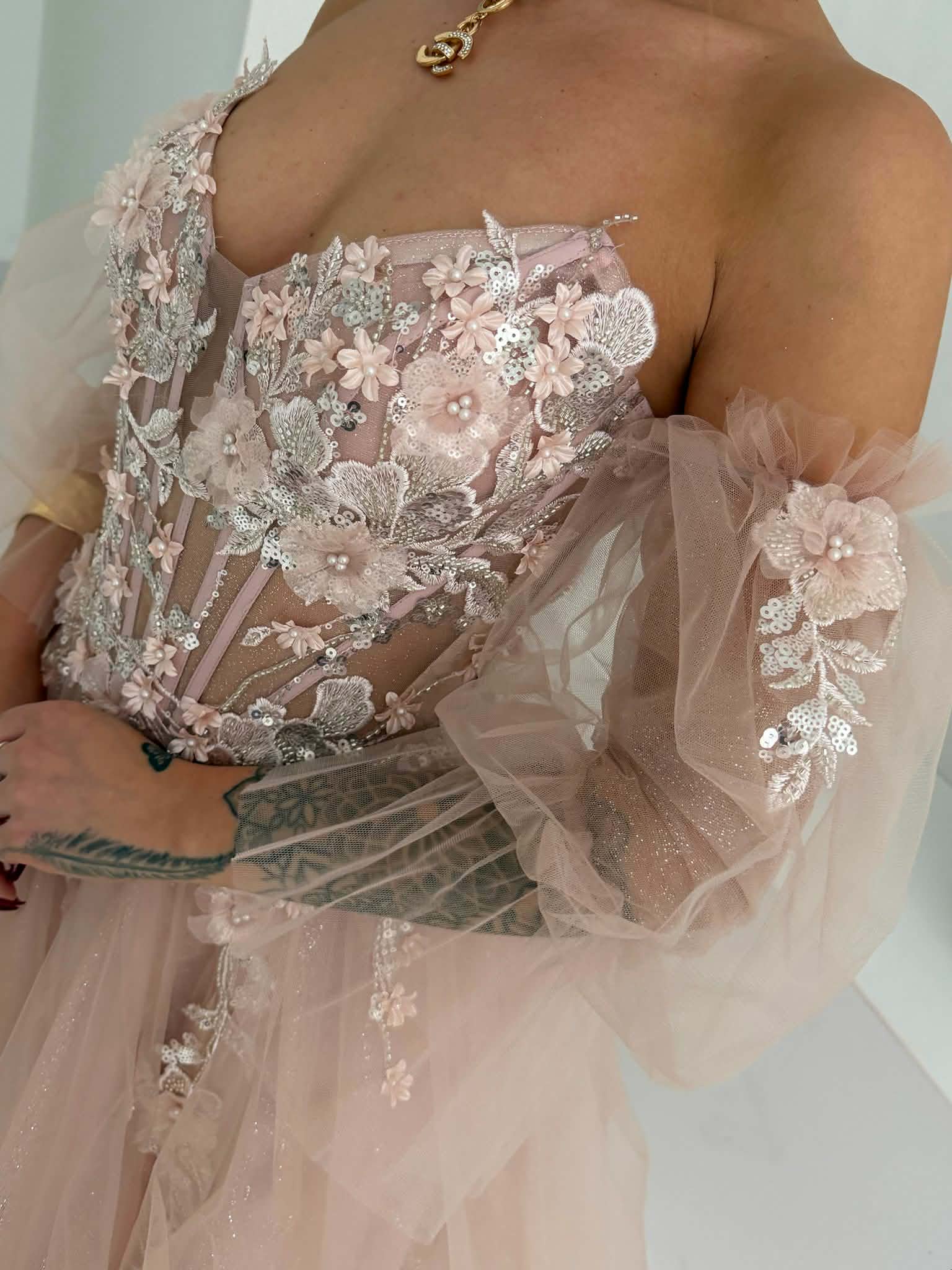 Maxi šaty Lossal s púdrovou ružovou korzetovou výšivkou z tylu