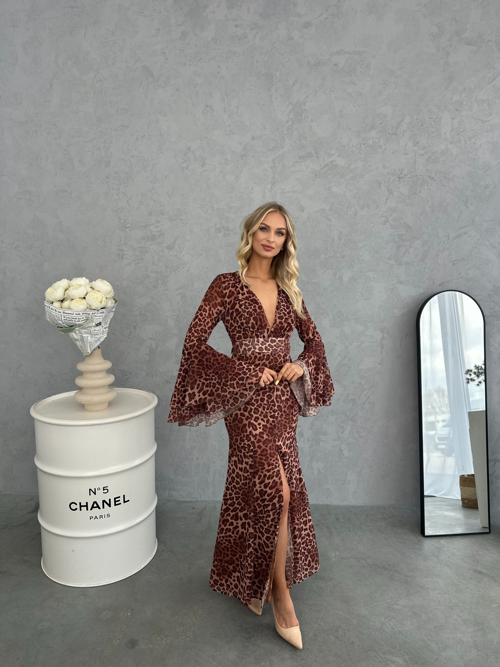 Tieto výrazné midi šaty s módnou leopardou potlačou sú ideálne pre ženy, ktoré rady vynikajú štýlom a vyjadrujú svoje sebavedomie. Zvieracia potlač dodáva šatám charakter a zároveň je v súlade s najnovšími módnymi trendmi. Šaty majú hlboký výstrih do V, ktorý krásne zvýrazňuje krk a dekolt a dodáva siluete nádych ľahkosti. Dlhé rukávy s jemným rozšírením dodávajú šatám eleganciu a jemný, romantický nádych. Midi dĺžka v kombinácii s ženským rozparkom na nohavici robí šaty neuveriteľne zmyselnými, no zároveň pohodlnými a ideálnymi na mnoho príležitostí. Ak sa neviete rozhodnúť, ktorú farbu si vybrať, veľkosť je pre vás to najlepšie kontaktuj nás cez Facebook alebo telefón. Ak veľkosť nie je na stránke, kontaktujte nás.