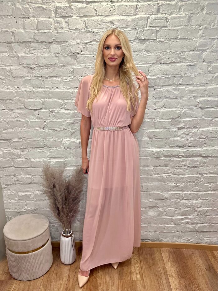 Sukienka maxi z krótkim rękawkiem. Niesamowicie kobieca, elegancka sukienka szyfonowa o długości maxi. Sukienka z okrągłym dekoltem. W talii elastyczna gumka zapewnia dopasowanie modelu do sylwetki co podkreśli kobiece kształty. Do sukienki doszyty został pasek z cyrkoni, który dodaje jej blasku i elegancji. Sukienka posiada podszewkę. Zwiewny fason fantastycznie układa się podczas ruchu. Idealna propozycja na ślub, wesele, rodzinne uroczystości, bankiety. Šaty sú vyrobené z ľahkého materiálu, takže sa v nich budete cítiť pohodlne. Dostupné v našej predajni vo viacerých farebných variantoch. Odporúčame pre dámy vo veľkosti SML XL