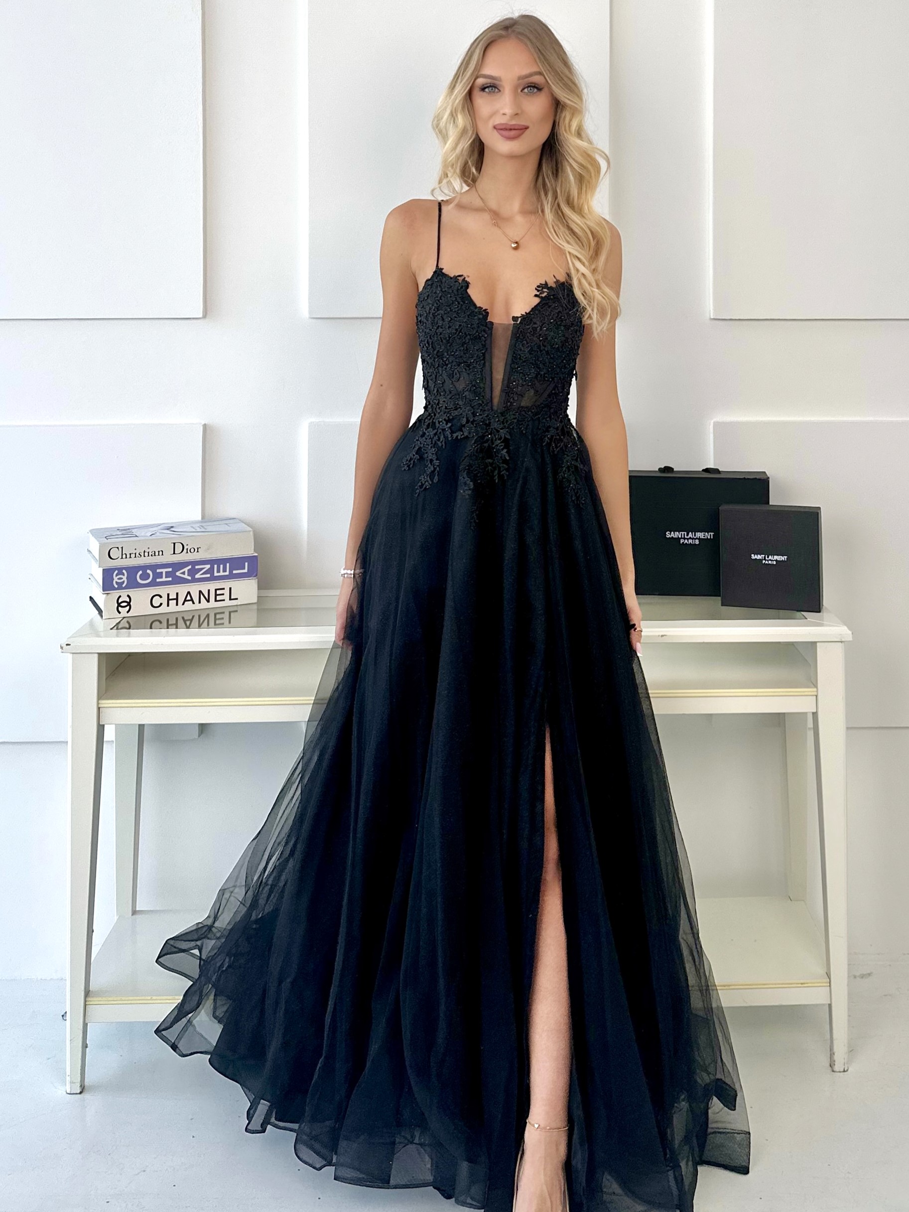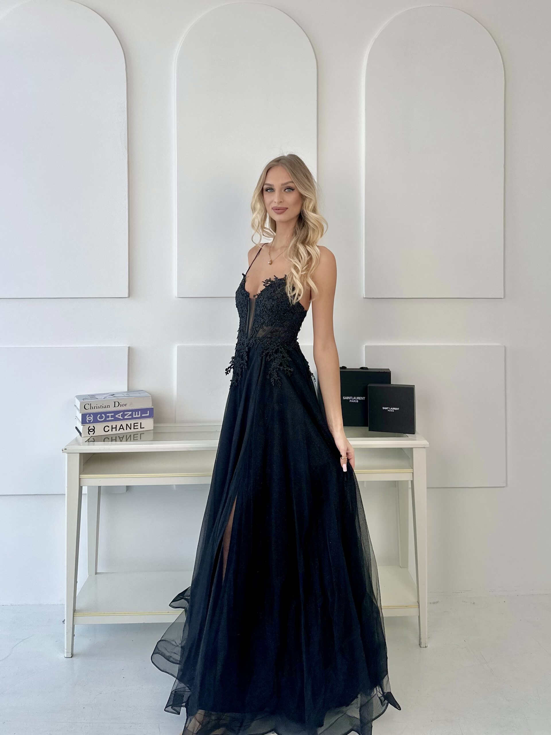 Čierne trblietavé tylové šaty Astra s ramienkami