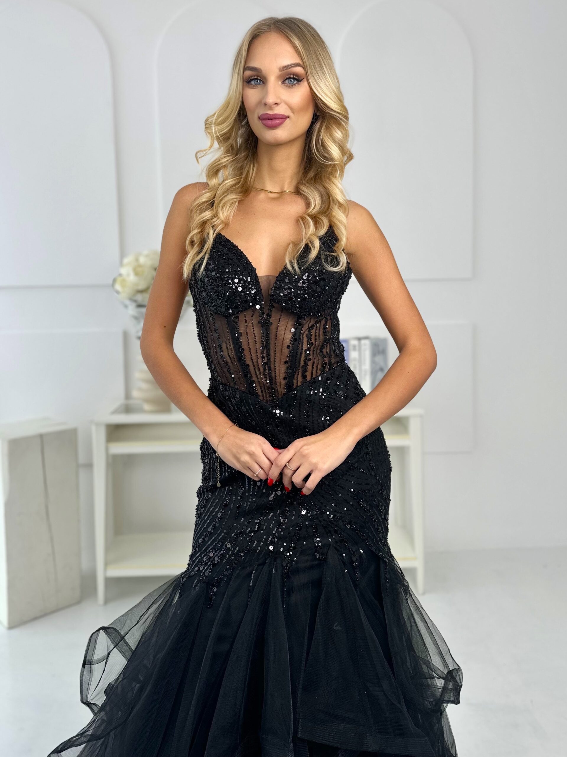 Krásne dlhé šaty s tylom a krásnym vrchným dielom ozdobeným nádhernými kryštálmi. Krásne zvýrazňujú ženské krivky – spodná časť šiat je celá z tylu. Šaty majú vpredu všité košíčky, takže nemusíte nosiť podprsenku. Šaty Bol vyrobený z niekoľkých vrstiev ľahkého tylu. Krásne jemný. šaty.Má odhalené ramená, perfektne sa prispôsobí siluete. Priliehavý strih šaty zvýrazňujú ženské črty. Sú perfektnou voľbou pre všetky druhy špeciálnych príležitostí. Dostupné vo veľkostiach SML . Šaty Madeline Fashion je perfektnou voľbou na svadby, stužkové, Silvestra a iné elegantné špeciálne udalosti. tylový maxi model sú perfektnou voľbou na večerné vychádzky, plesy alebo špeciálne príležitosti. Čierna farba a jemné detaily dodávajú šatám neuveriteľne elegantný a ženský vzhľad. Ak sa neviete rozhodnúť, ktoré si vybrať, veľkosť je pre vás to najlepšie kontaktuj nás cez Facebook alebo telefón. Ak veľkosť nie je na stránke, kontaktujte nás.