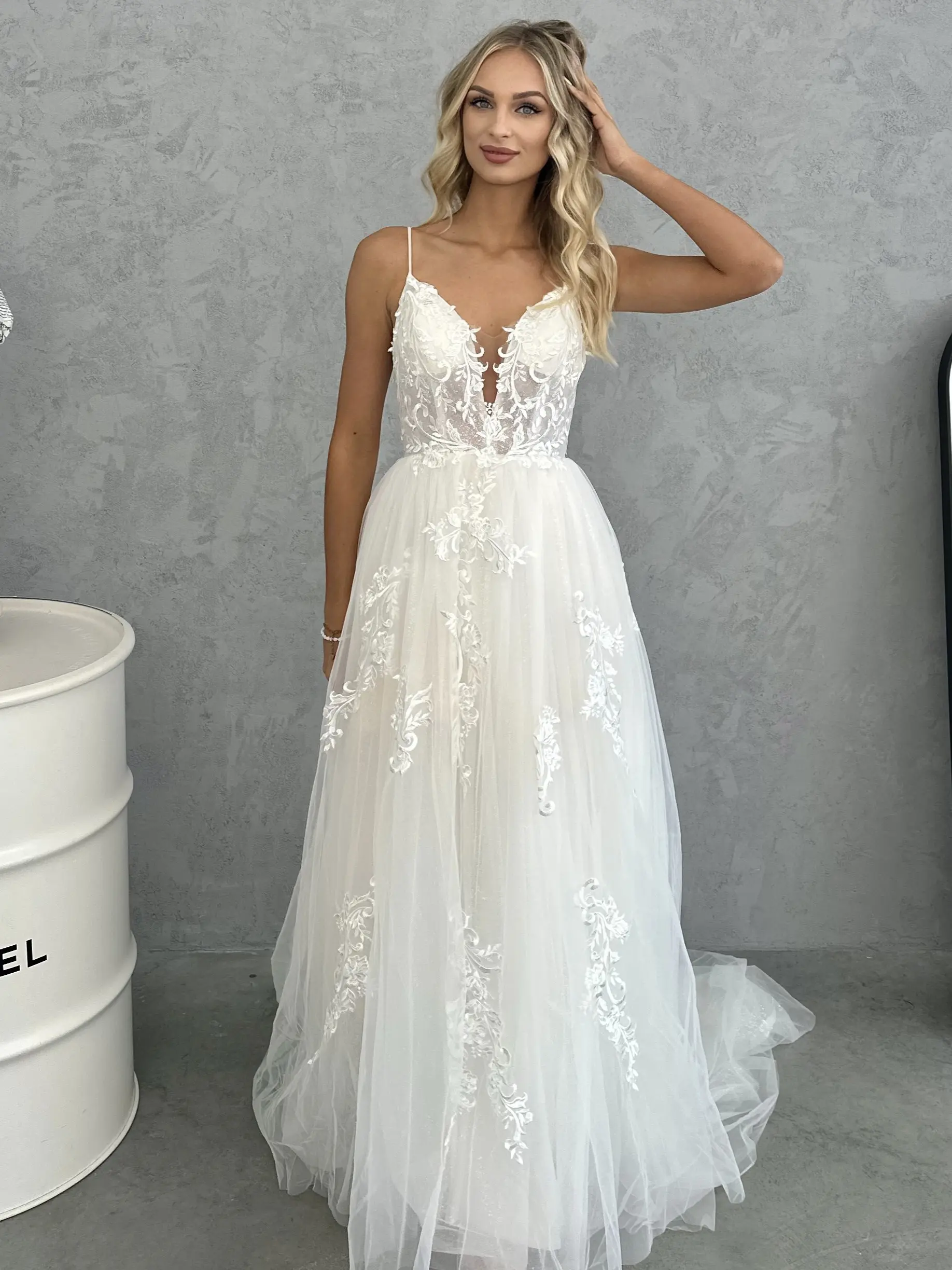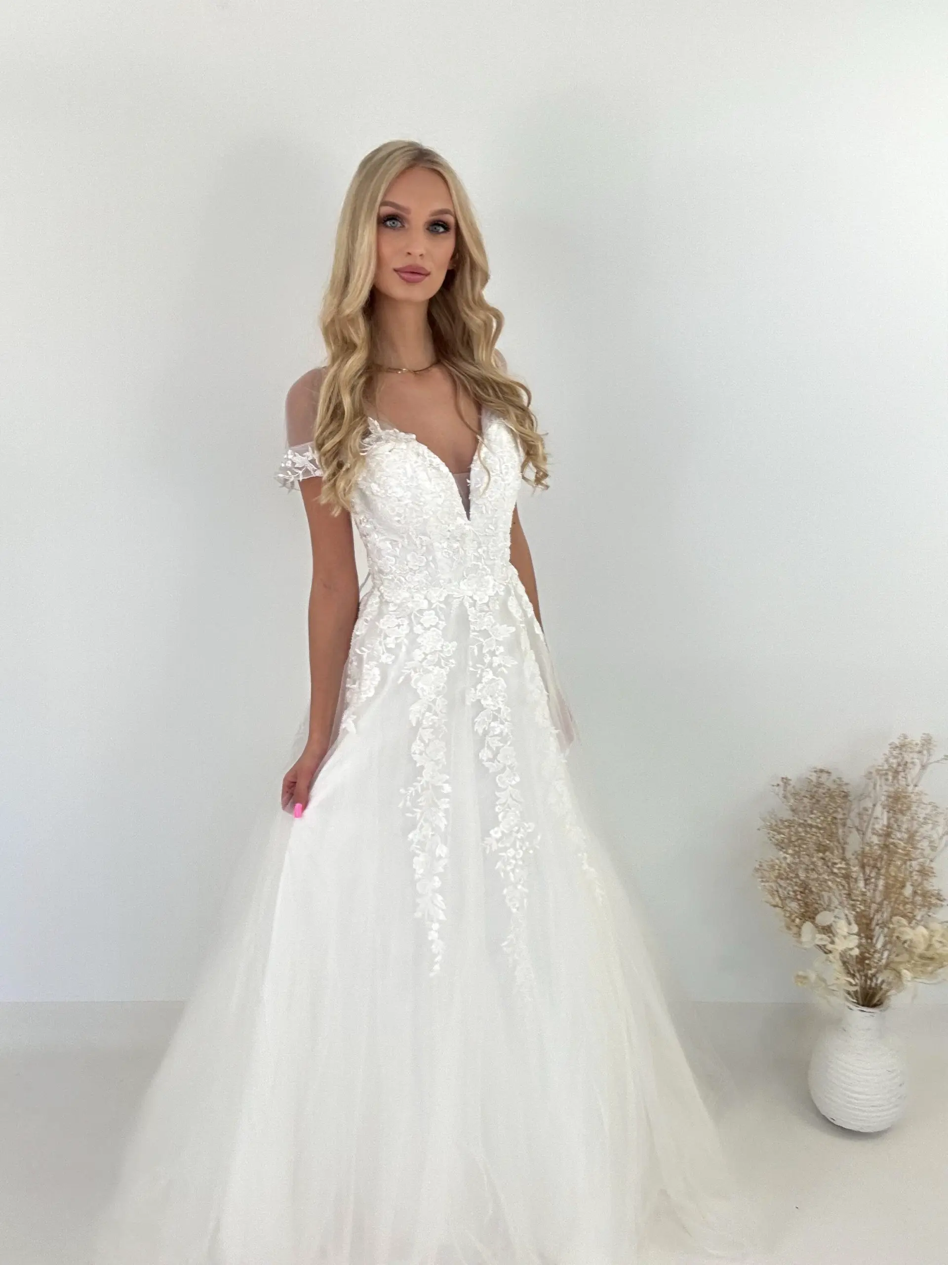 Zaujme svojim výrazným korzetom a ľahkým tylom. Je to perfektná voľba pre ženy, ktoré snívajú o vzhľade rozprávkovej princeznej. 👰
