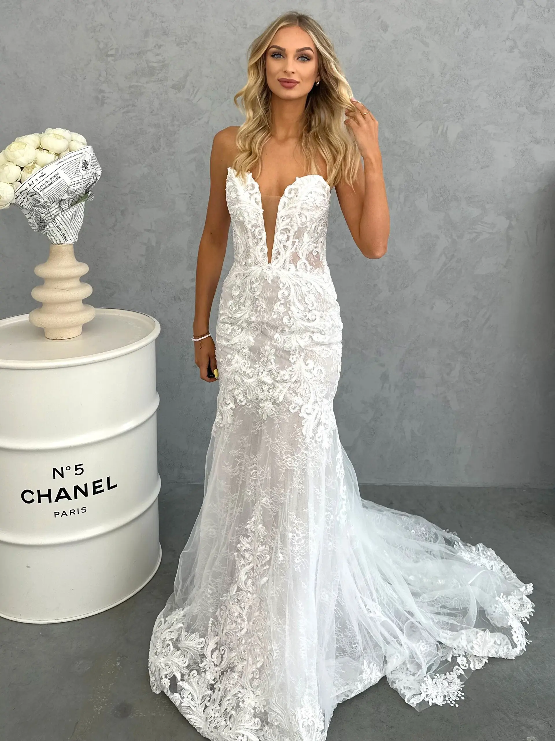 - Čipkované svadobné šaty Kombinujú klasickú krásu s modernými trendmi, vďaka čomu sú ideálne pre akýkoľvek štýl obradu.