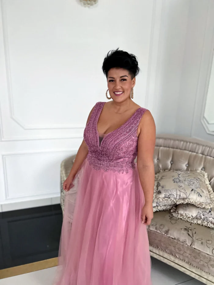 Piękna długa suknia wieczorowa tiulowa z koronkową górą zdobioną cudownymi haftami oraz zdobieniami w postaci mieniących się kryształków. Pięknie eksponuje kobiece kształty- dół sukienki wykonany w całości z lejącego się materiału. Sukienka pięknie eksponuje plecy – dekolt w kształcie litery V zarówno z przodu jak i tyłu . Sukienka posiada z przodu wszyte miseczki, dzięki czemu nie trzeba zakładać biustonosza. Wyprodukowana i uszyta w Polsce.