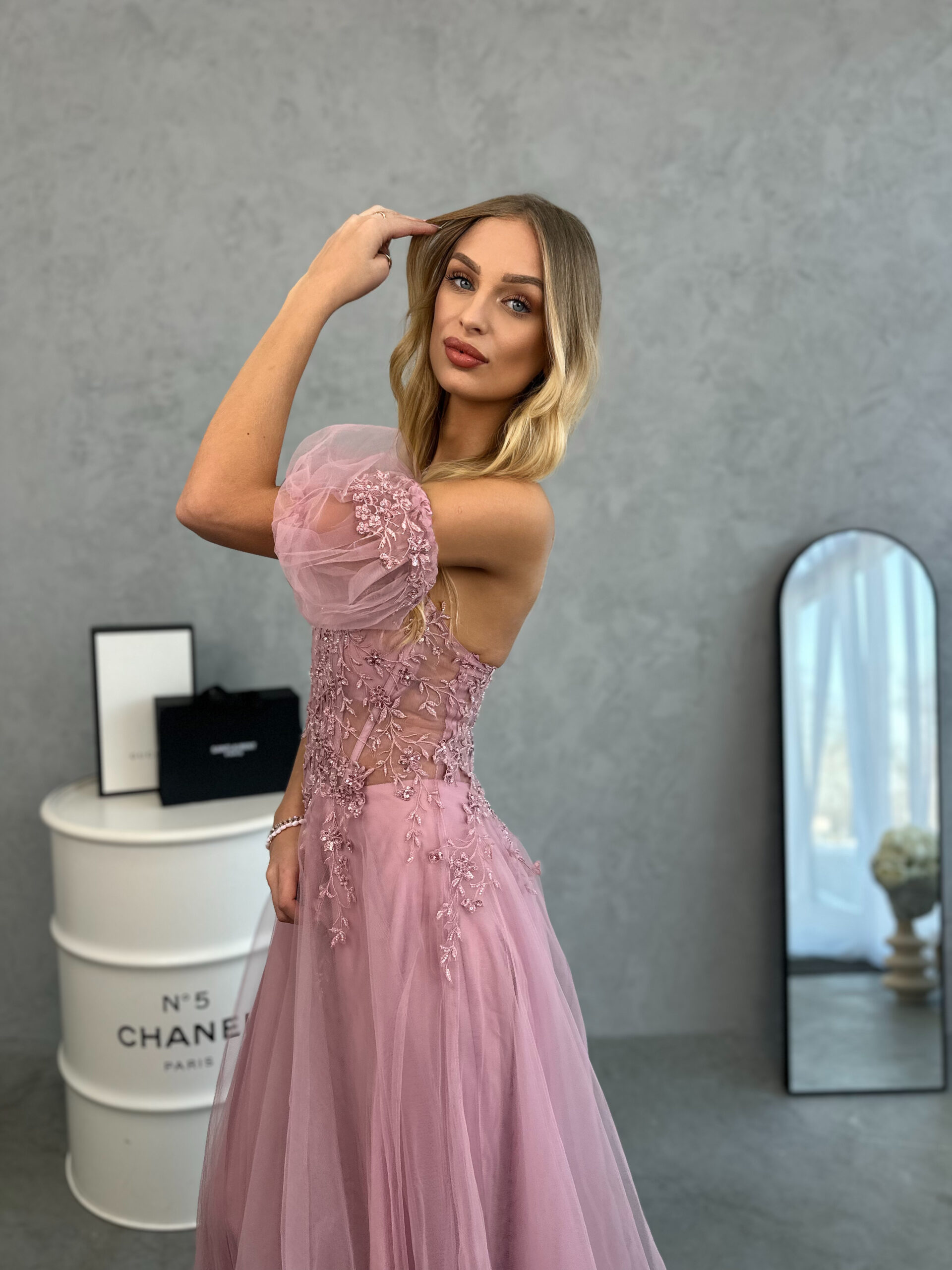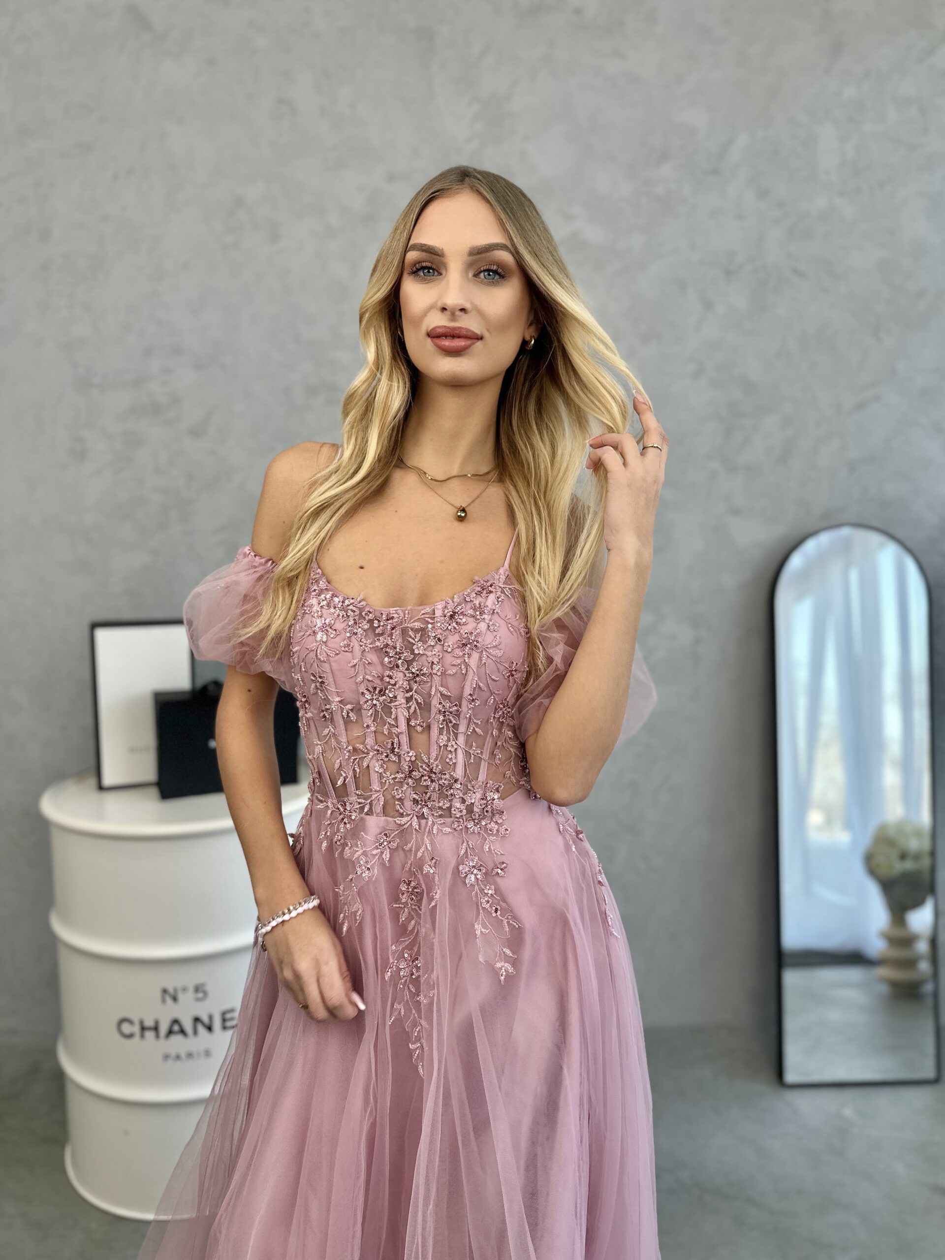 Sukienka Maxi Tiulowa Gorsetowa Novira Wrzosowa