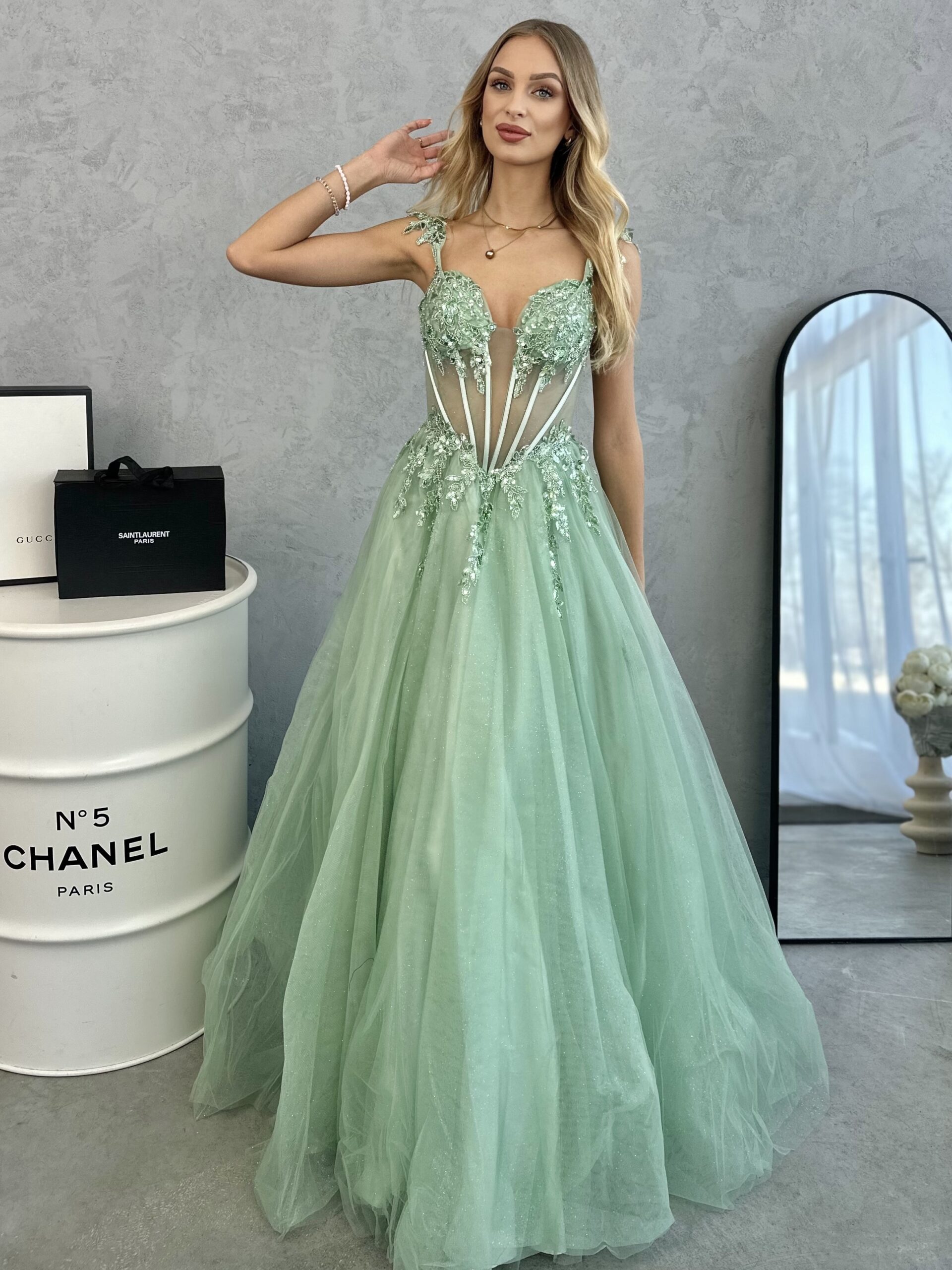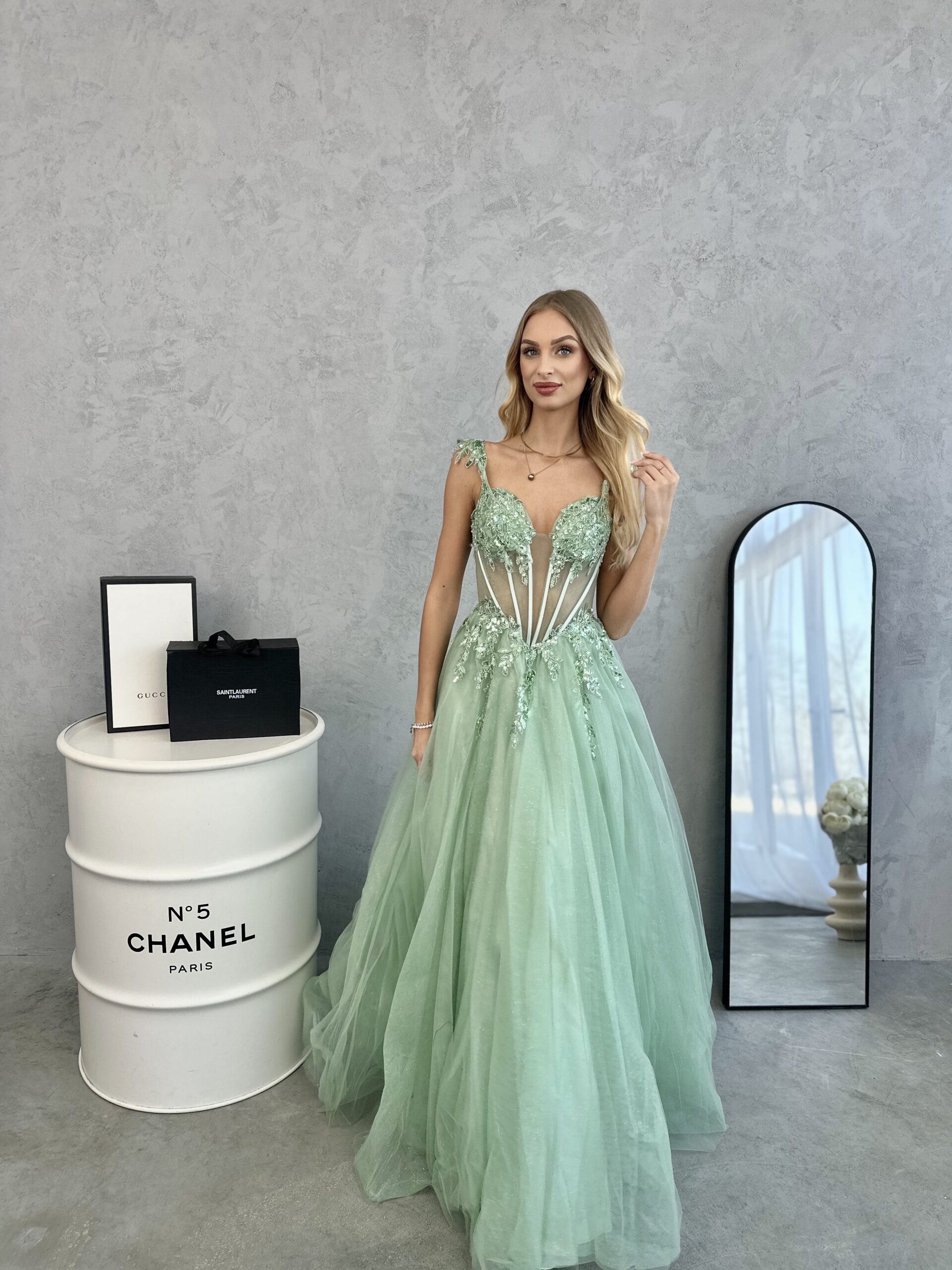 Sukienka Maxi Tiulowa Gorsetowa Ravelle Szałwia