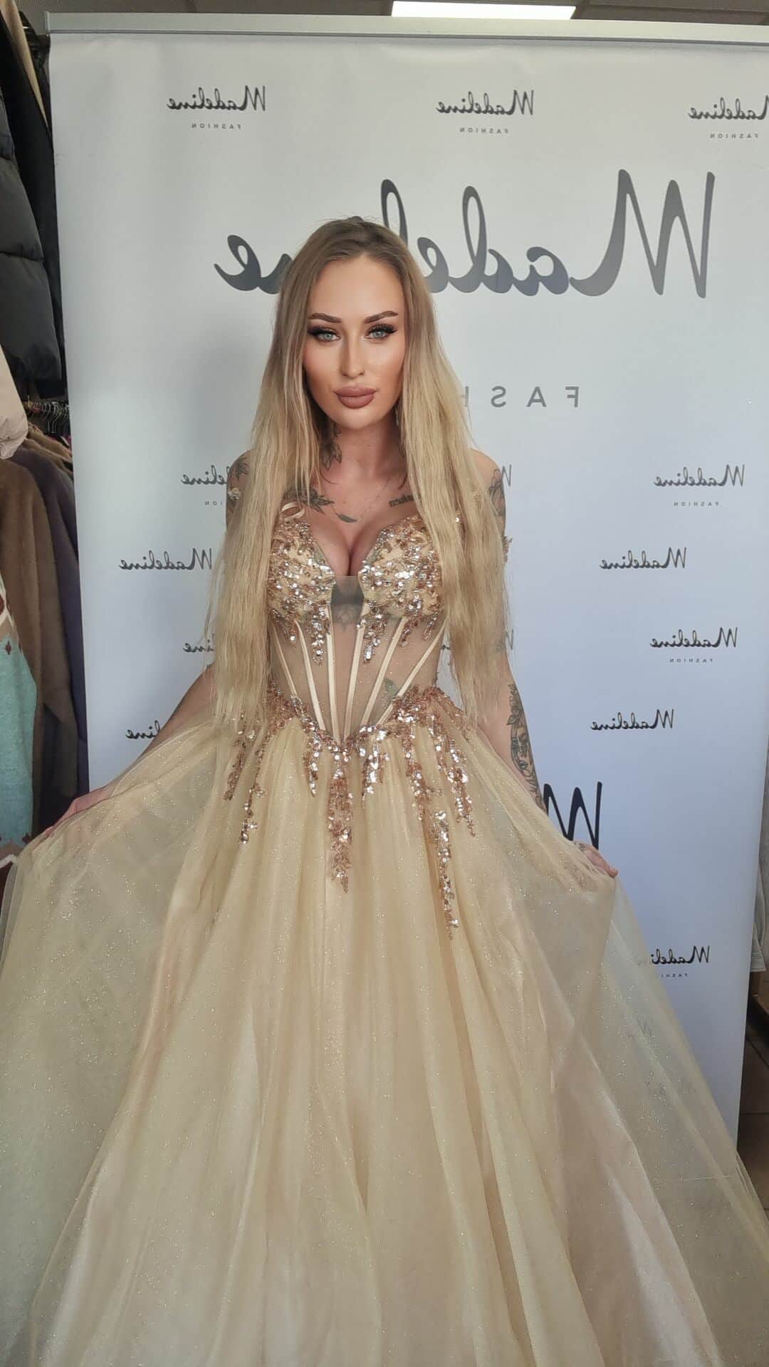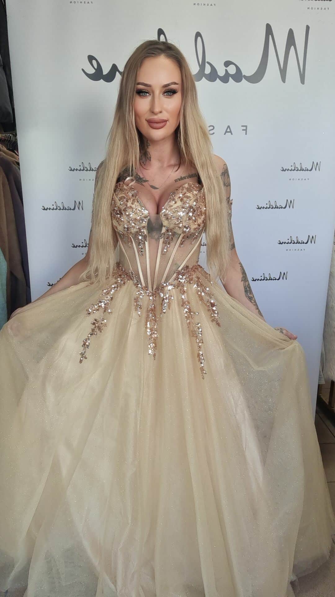 Piękna długa suknia mocno zdobiona haftami oraz zdobieniami w postaci mieniących się kryształków. Pięknie eksponuje kobiece kształty. Sukienka pięknie eksponuje plecy – hiszpanka . Wymarzona suknia o długości maxi z odkrytymi ramionami i zdobioną górą. Przeszycia dają niesamowity efekt, a kryształki cudownie mienią się w świetle. Zwężana na wysokości pasa wspaniale podkreśla talię. Plecy wspaniałe wycięte, w kształcie litery U. Dół sukienki został wykonany z kilku warstw lekkiego tiulu który znajduje się pod spodem. Sukienka Stella posiada z przodu wszyte miseczki, dzięki czemu nie trzeba zakładać biustonosza. Wyprodukowana i uszyta w Polsce. Dostępna w rozmiarach XS S M L . Sukienki od madelinefashion to doskonały wybór na wesele, studniówkę, sylwestra i inne eleganckie imprezy okolicznościowe. Dostępna w naszym e-sklepie w kilku wariantach kolorystycznych, więc nie wahaj się i wybierz ten, który jest dla Ciebie idealny. Jeśli nie możesz zdecydować, który kolor, rozmiar jest dla Ciebie najlepszy, skontaktuj się z nami za pośrednictwem Facebooka lub telefonu. W przypadku braku rozmiaru na stronie prosimy o kontakt.