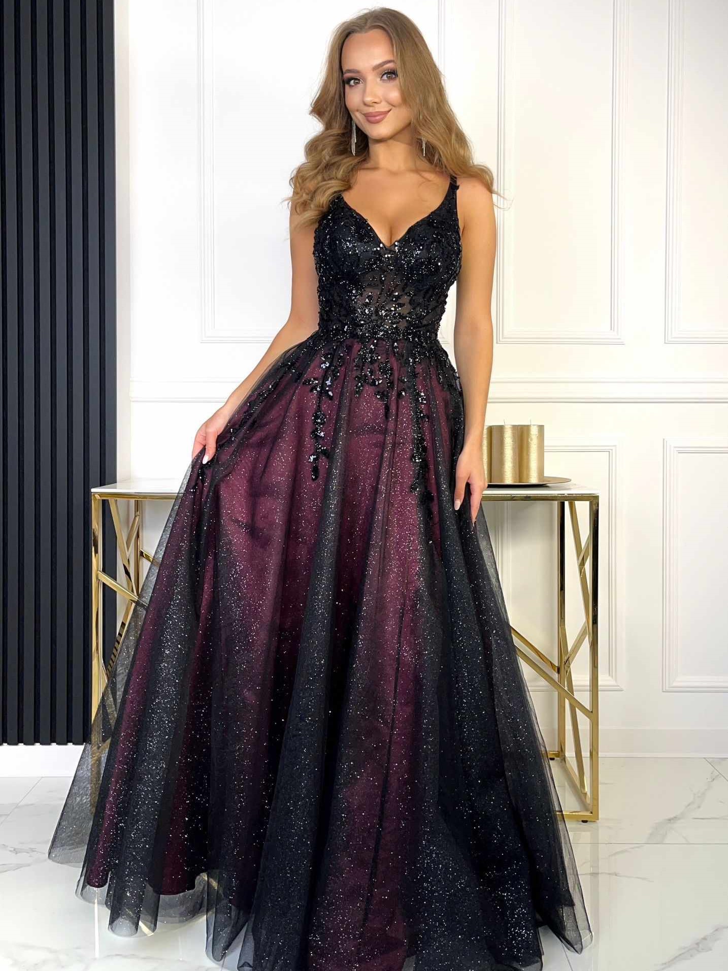 👉 Opis: Czarne tiule, subtelny połysk i lekko rozkloszowany dół tworzą perfekcyjną kreację na studniówkę.