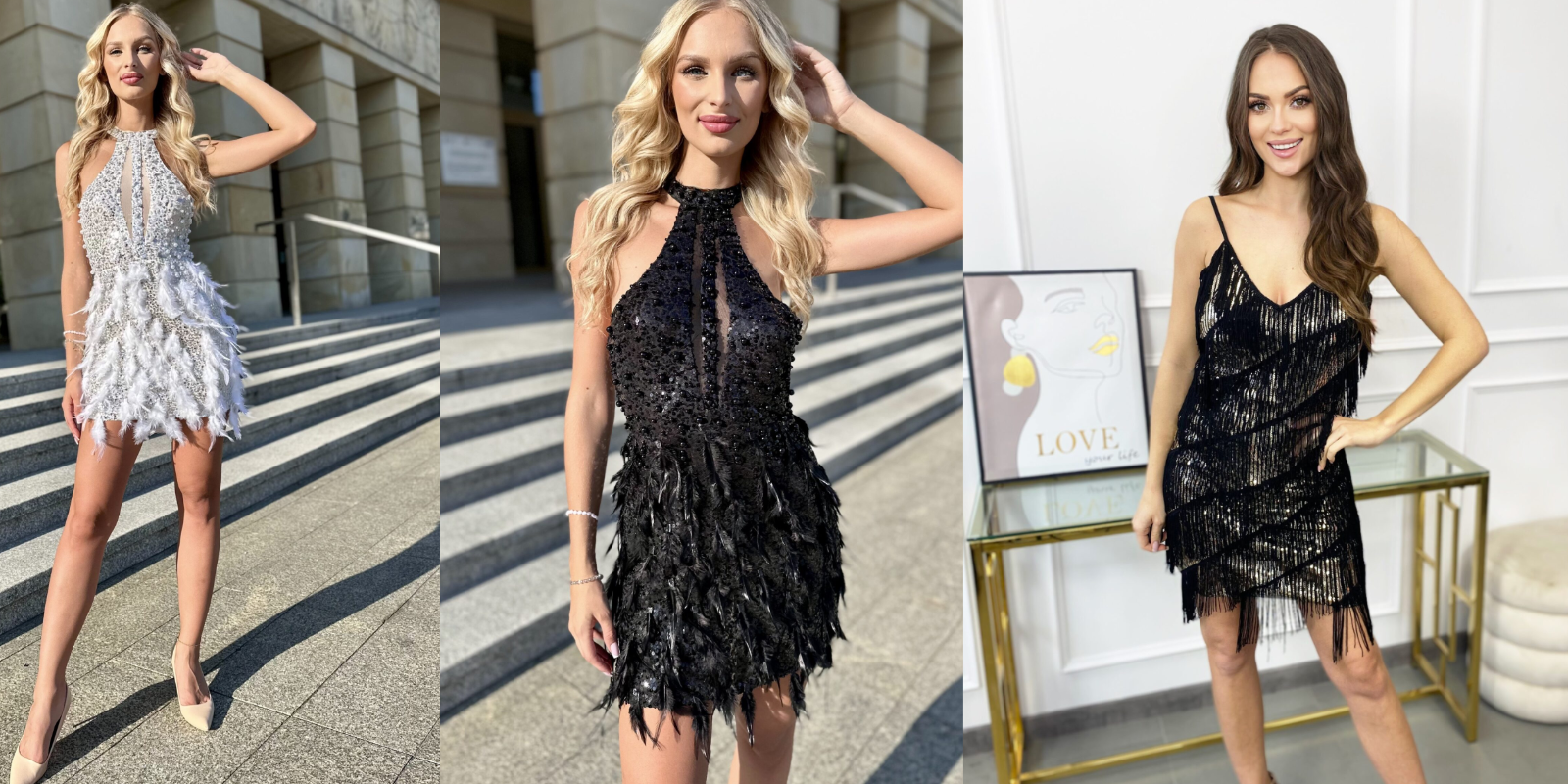 - Suknia z Piórkami Dopasowana Krótka Sequin Czarna – klasyka w nowoczesnym wydaniu.